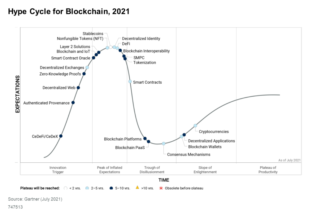 Gartner hype cycle drills into the five key phases of the blockchain technology life cycle. It helps to seperate the hype from the actual drivers of the blockchain’s commercial promise. The idea of presenting this is to reduce the risk of undertaking technology investment decisions.